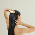 ブラシを使い、頭頂部側から毛先側にゆっくりなでるように動かし、髪全体にトリーメントをなじませます。